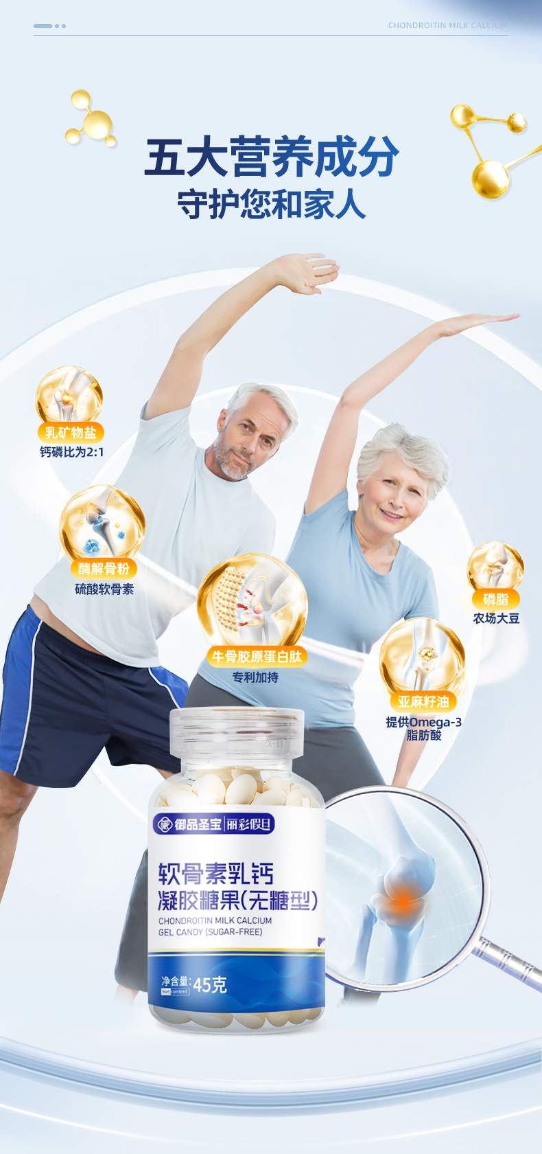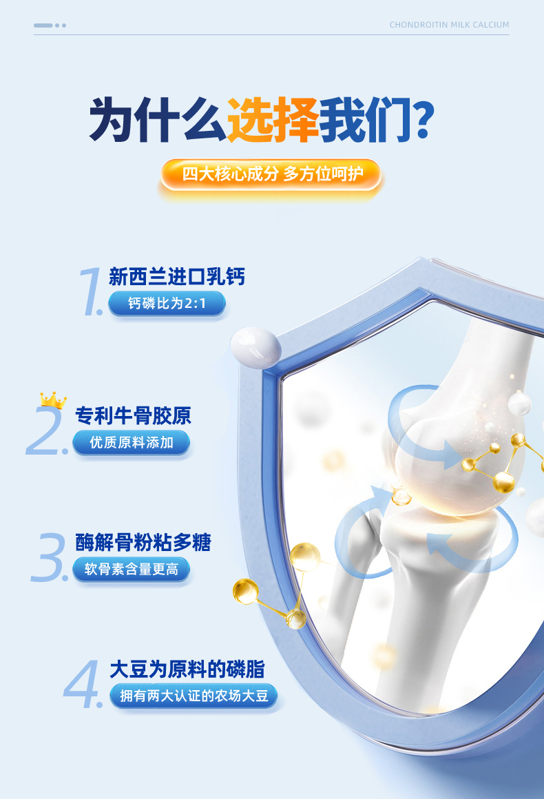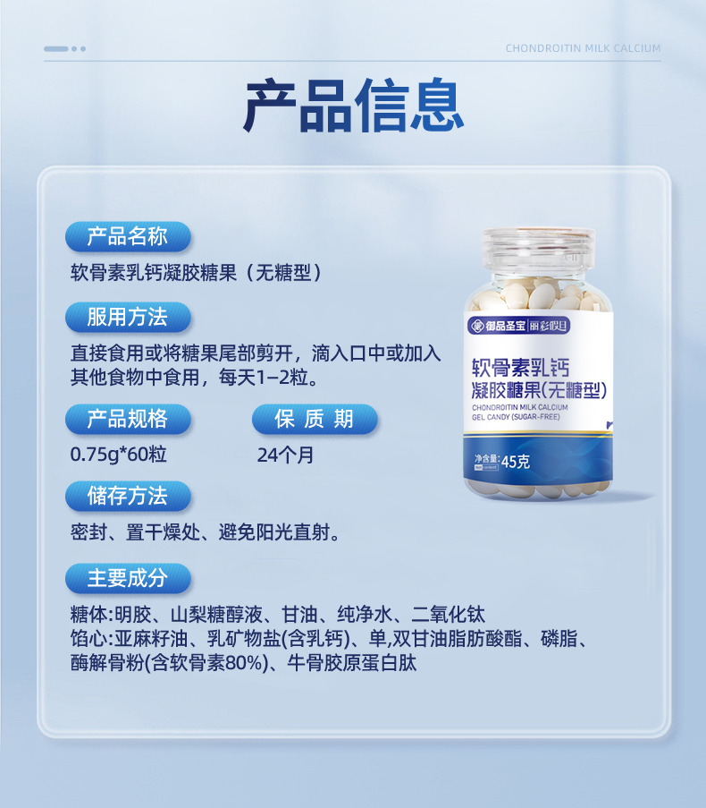 每100g含4800mg乳钙+软骨素,新西兰进口乳钙;搭配专利牛骨胶原蛋白肽;采用无糖配方,凝胶形态,直接吃或剪开滴食都方便