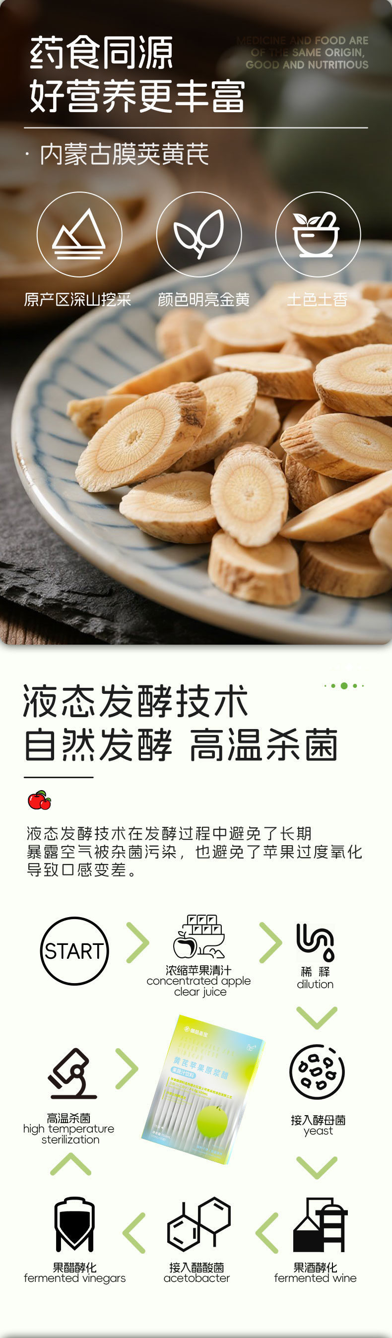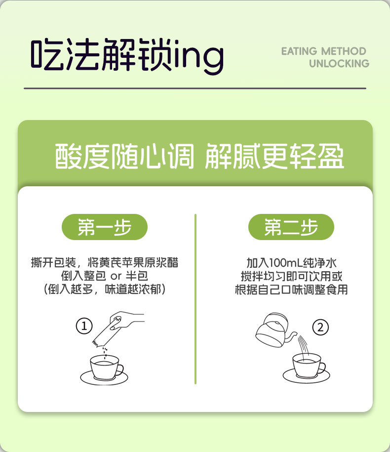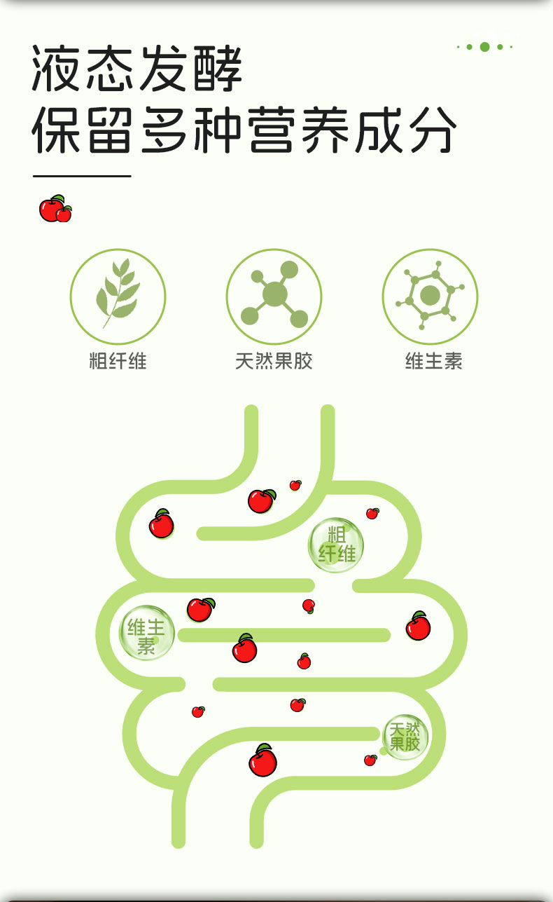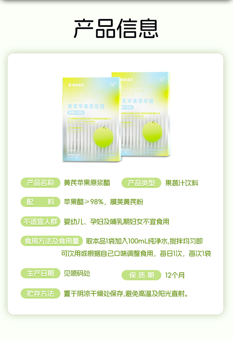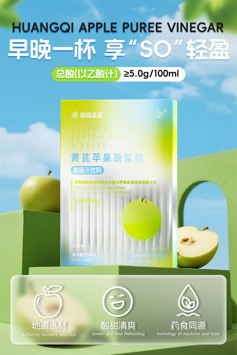 总酸(L以乙酸计)>5.0g/100mL;苹果原料选用烟台红富士苹果,搭配内蒙古黄芪;餐前来一包,控糖更高效