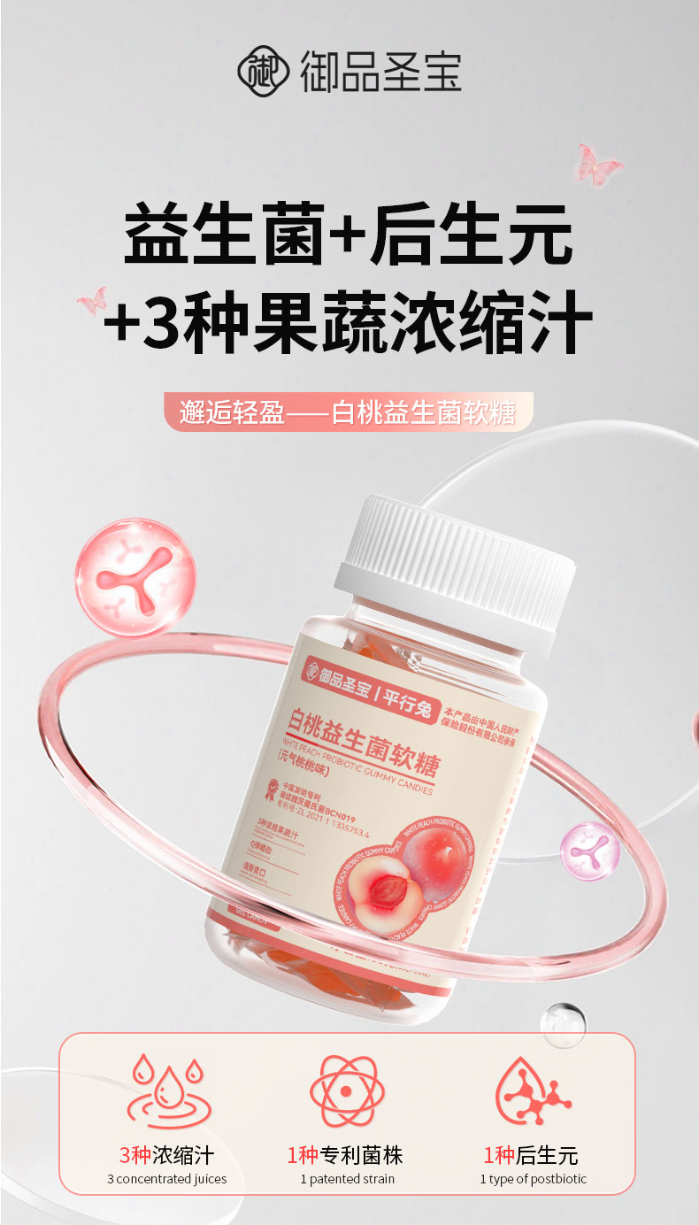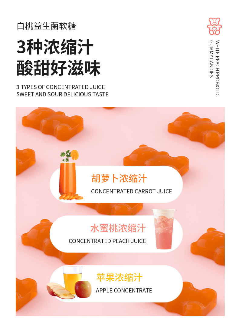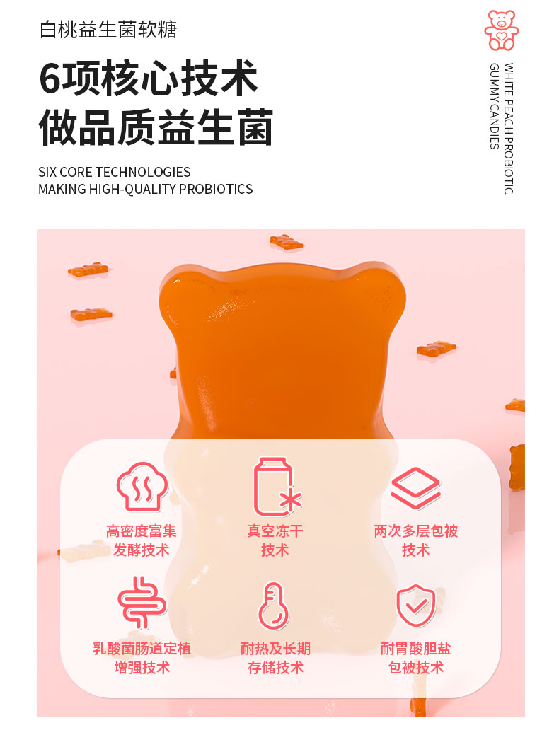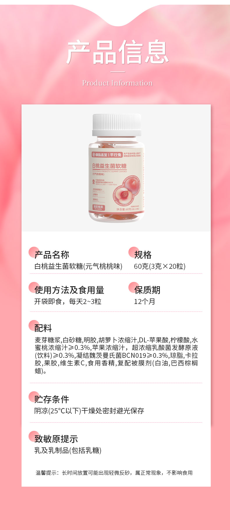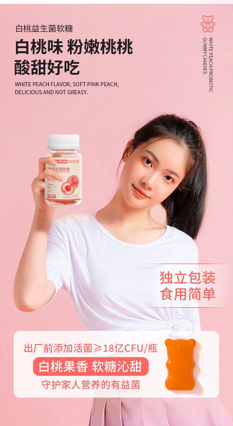 白桃浓缩果汁带来天然酸甜,搭配VC补充日常所需;益生菌+后生元共 18亿CFU/瓶;酸甜好吃,3g/粒独立包装