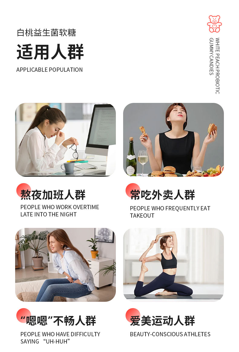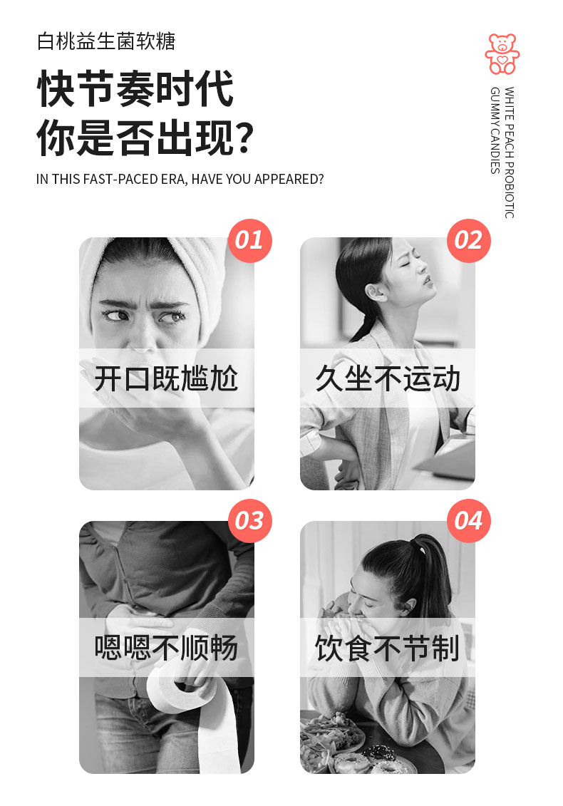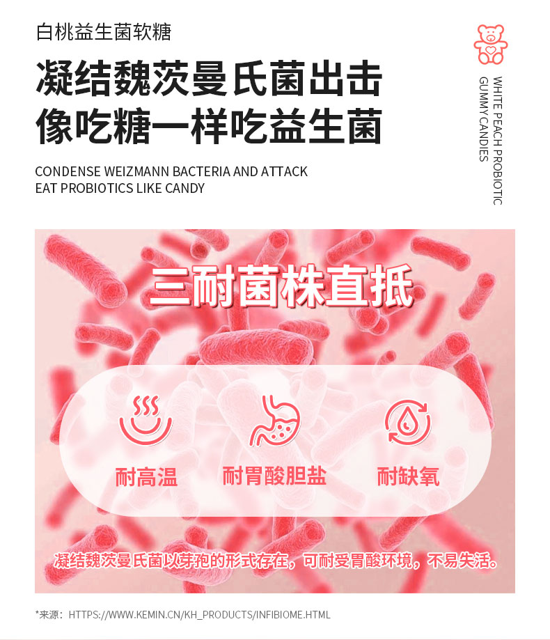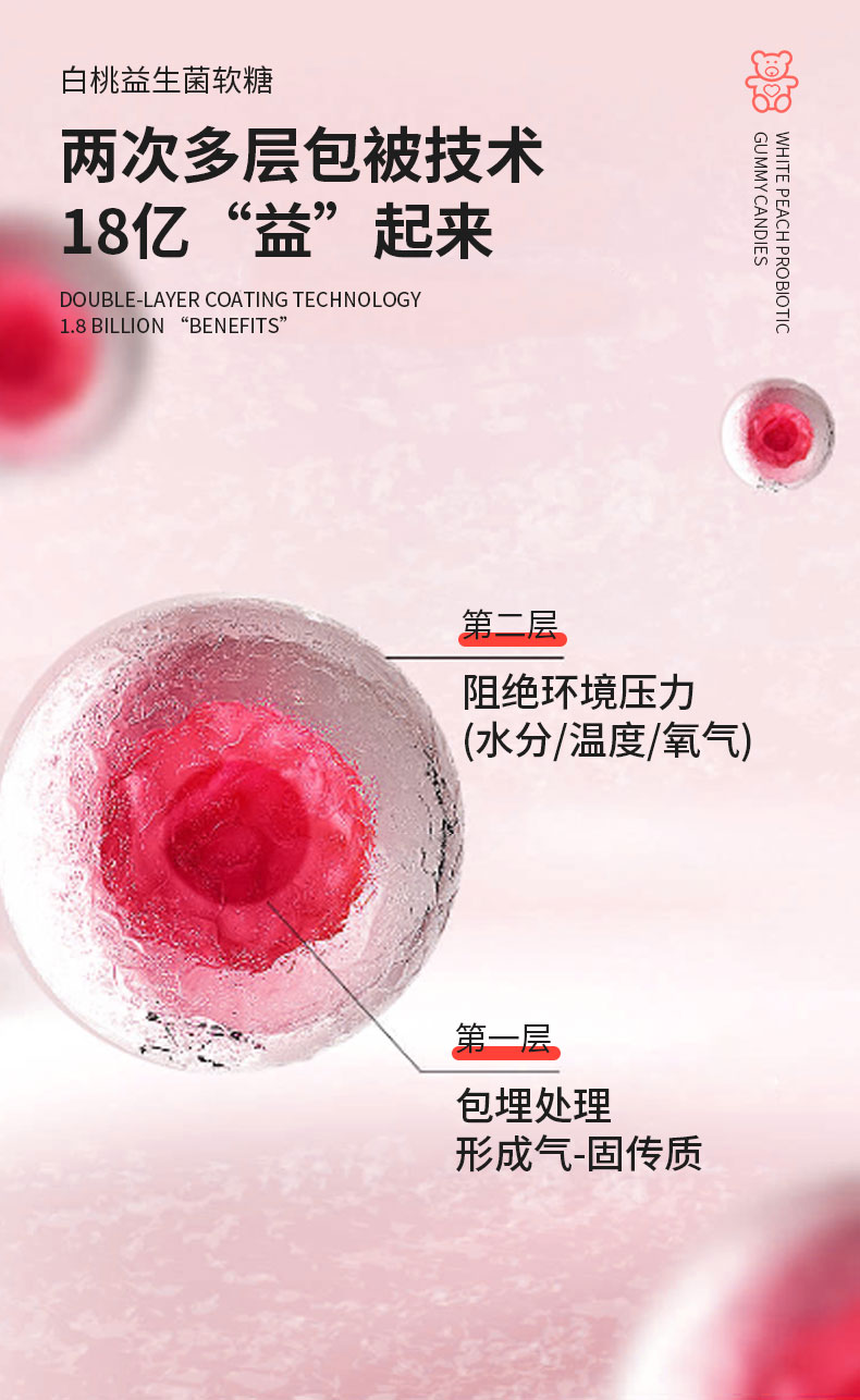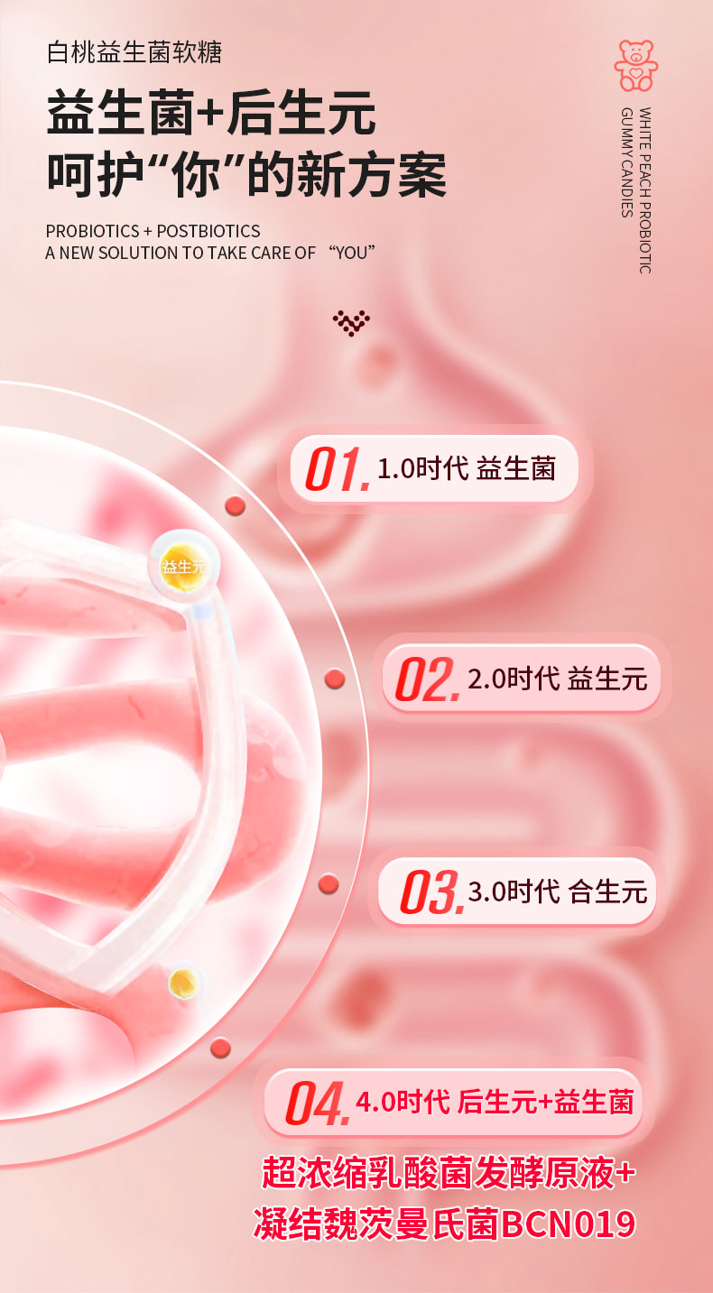 白桃浓缩果汁带来天然酸甜,搭配VC补充日常所需;益生菌+后生元共 18亿CFU/瓶;酸甜好吃,3g/粒独立包装